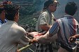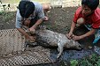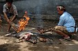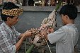 Gruppe Männer, die das Babi Guling (Spanferkel) und gebratene Hühnchen
